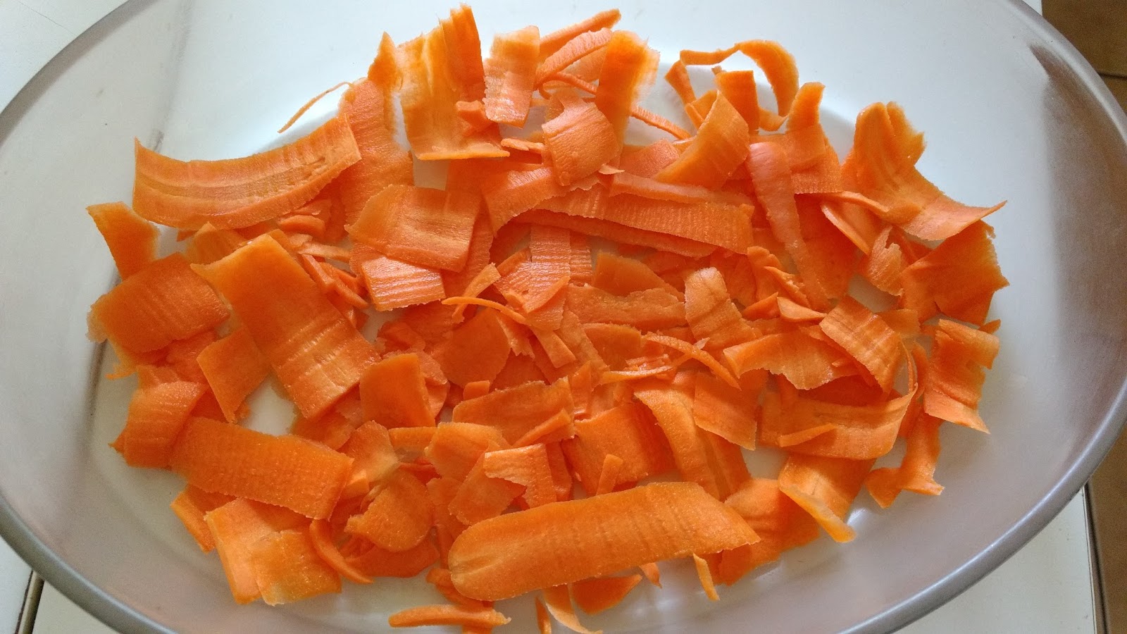 Disposez dans un plat les épluchures de carottes et  laissez sécher plusieurs heures pour les vider de leur eau et éviter qu’elles pourrissent une fois dans l’huile.
