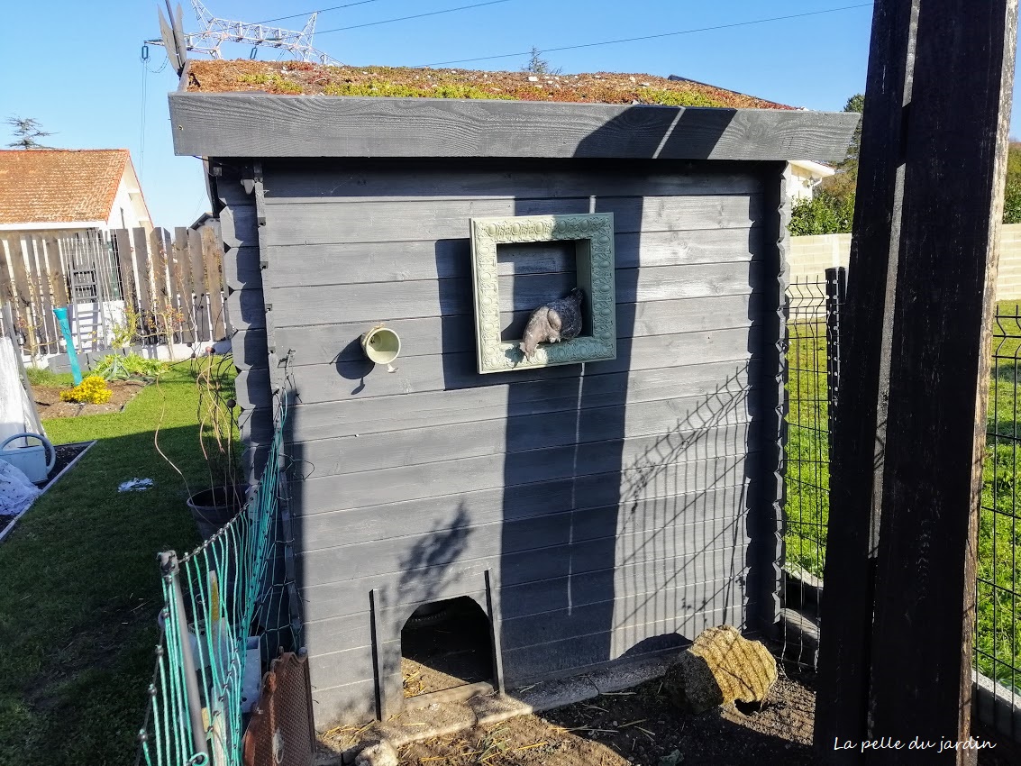 Ses dames ont un séjour traversant avec 2 ouvertures et donc 2 trappes, d’un côté elles ont un petit enclos mais très ombragé ( nord de la maisonnette) et de l’autre un grand air de promenade avec un petit acès au jardin. Elle ont vite compris quand l’accès était ouvert et quand il était fermé…C’est pas si bête que ça une poule!
