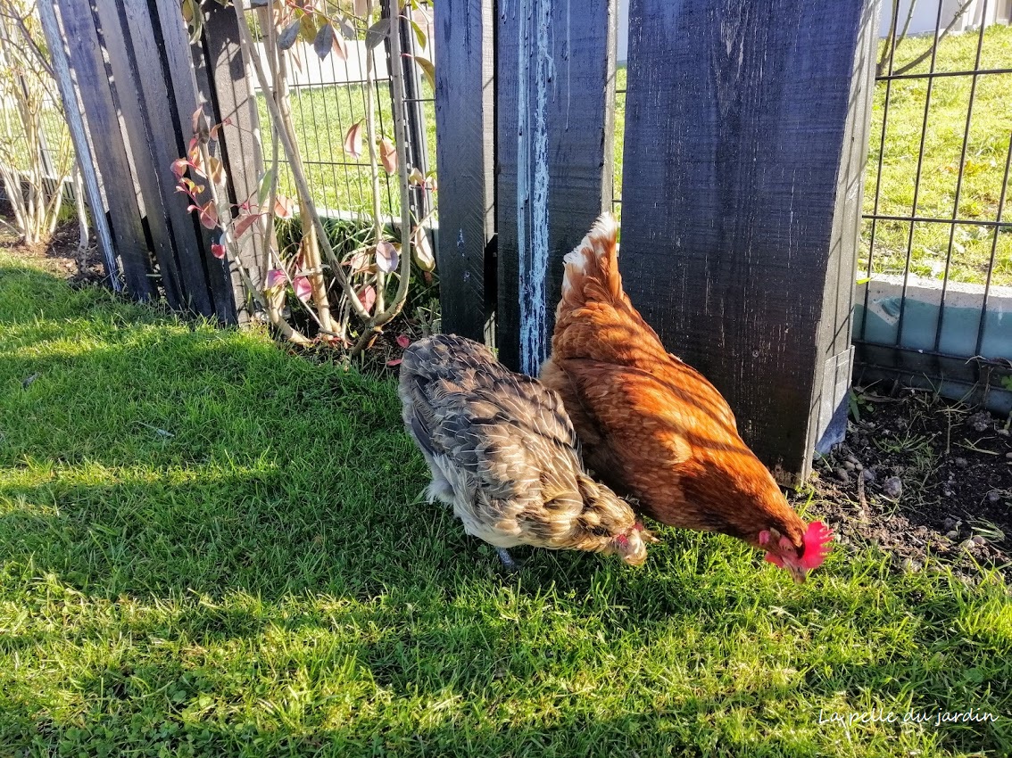 Cependant, je crois que j’ai un gros problème affectif avec les animaux et trouvant qu’elles tournaient trop en rond et quelles n’avaient plus d’herbe à picorer, j’ai créé un passage pour qu’elles puissent accéder à une autre parcelle du jardin, qui, initialement communique avec le potager. Cette parcelle je leur ouvre et ferme avec un grillage amovible plusieurs heures par jour, souvent lorsque je suis aussi au jardin et là on arrive à plus de 200 m² de balade. Le bonheur pour mes poulettes. J’aime les voir picorer dans l’herbe et être avec elle dehors et en leur octroyant un grand espace, je minimise les maladies, les parasites et je leur offre de l’herbe à volonté.