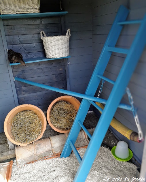 J’ai installé 2 nichoirs avec des gros pots en terre cuite couchés et remplis de paille mais ces dames ont décidé de pondre toujours dans le même, allez savoir pourquoi! Un raisonnement de poules qui m’échappe… Elles se perchent pour dormir soit sur une échelle, soit sur une étagère ou encore sur un perchoir en travers de la pièce.