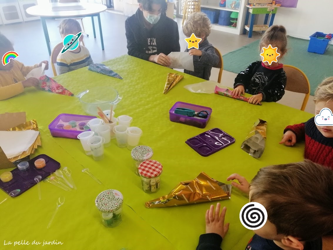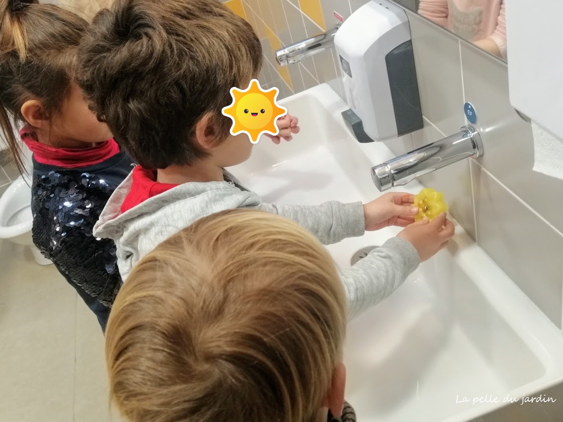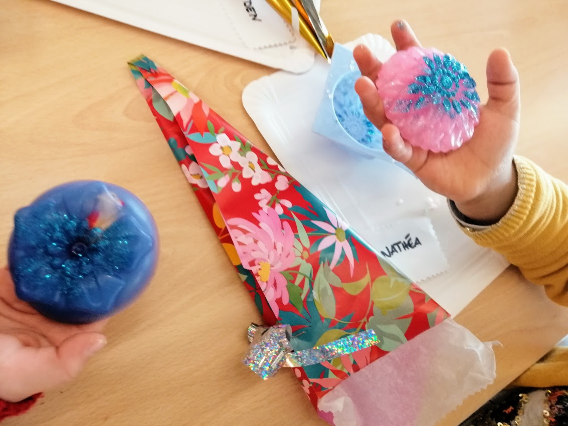 Avant de commencer, nous nous sommes lavés les mains avec des savons que Céline a fait pour le centre. L’occasion rêvée pour tester ces supers savons colorés et pailletés…
