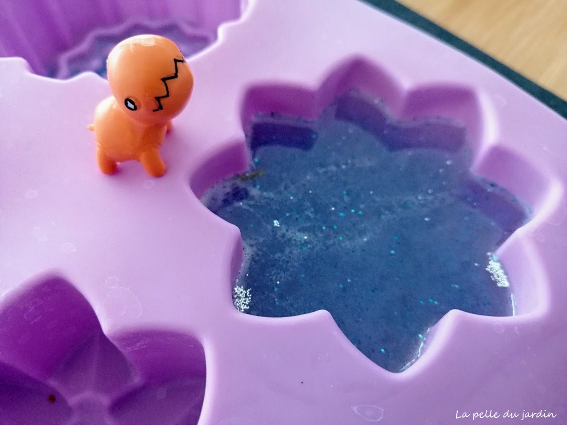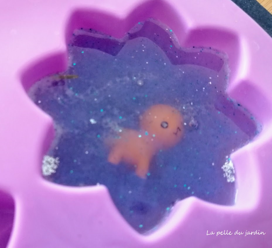 Dernière étape, nous avons versé dans le moule et plongé la petite figurine surprise.