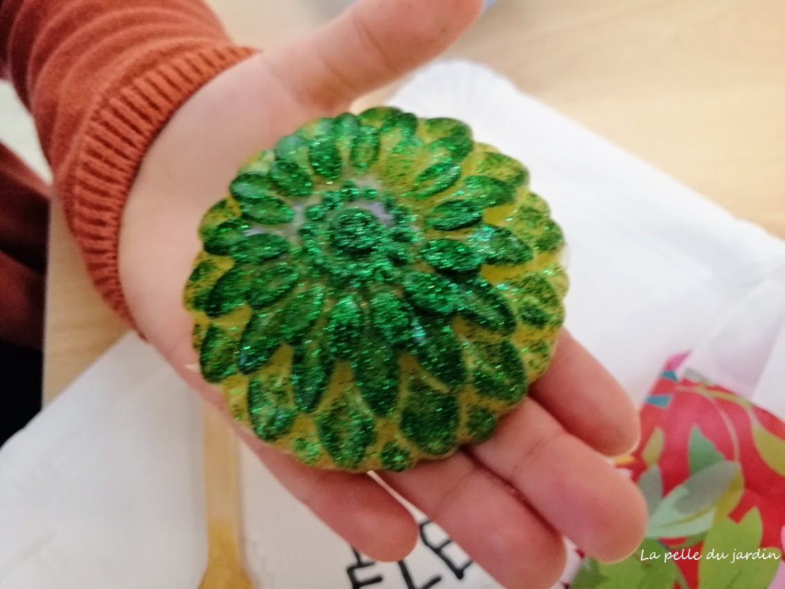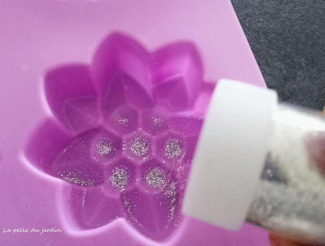 Nous avons commencé par tapisser le fond du moule en silicone de 2 à 3 pincées de paillettes. Il y avait des paillettes de toutes les couleurs.