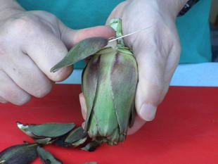 ♦ Commencez par retirer les feuilles du pied et du tour de l’artichaut cru. Vous pouvez procéder à la main ou avec un couteau, mais l’important est de bien casser les feuilles à leur base, pour ne laisser sur l’artichaut que la partie tendre de la feuille et jeter le haut de la feuille. Faites le en faisant tourner l’artichaut sur lui même au fur et à mesure jusqu’à atteindre les feuilles très tendres du centre.