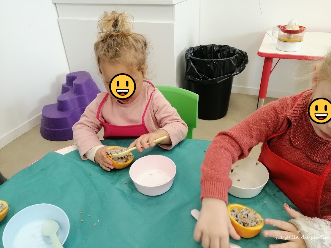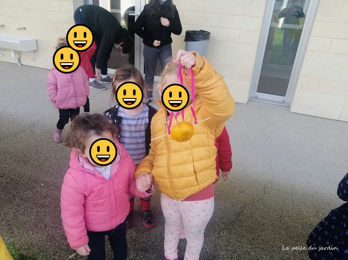 Avec les enfants de petite section, nous avons réalisé des mangeoires avec une demi-orange, et oui ! Nul besoin de plan ingénieux pour fabriquer une mangeoire pour oiseaux : une orange suffit !
