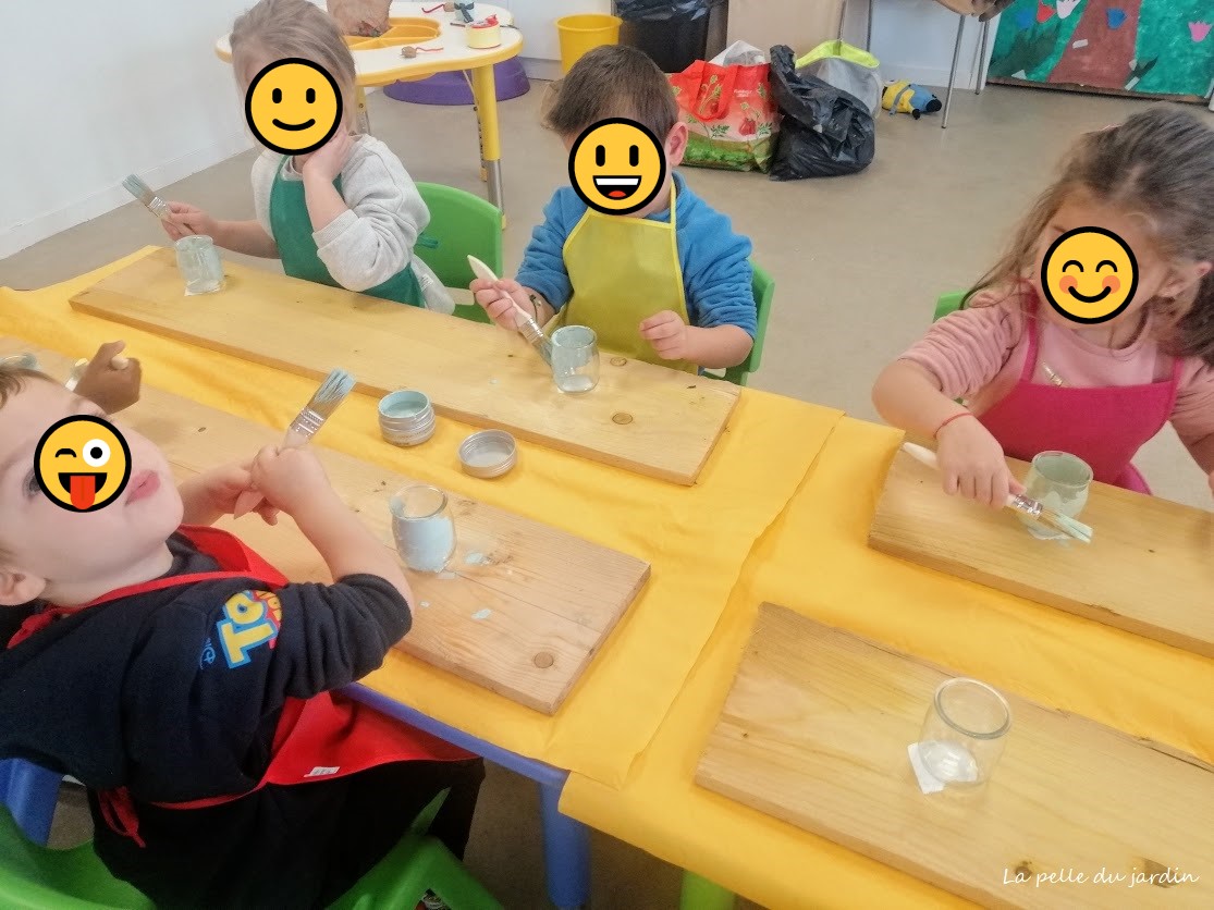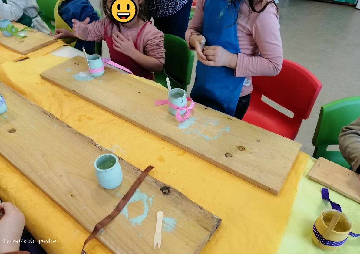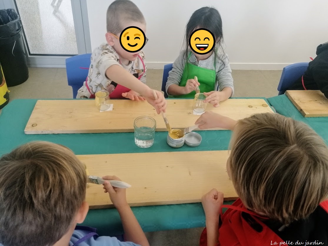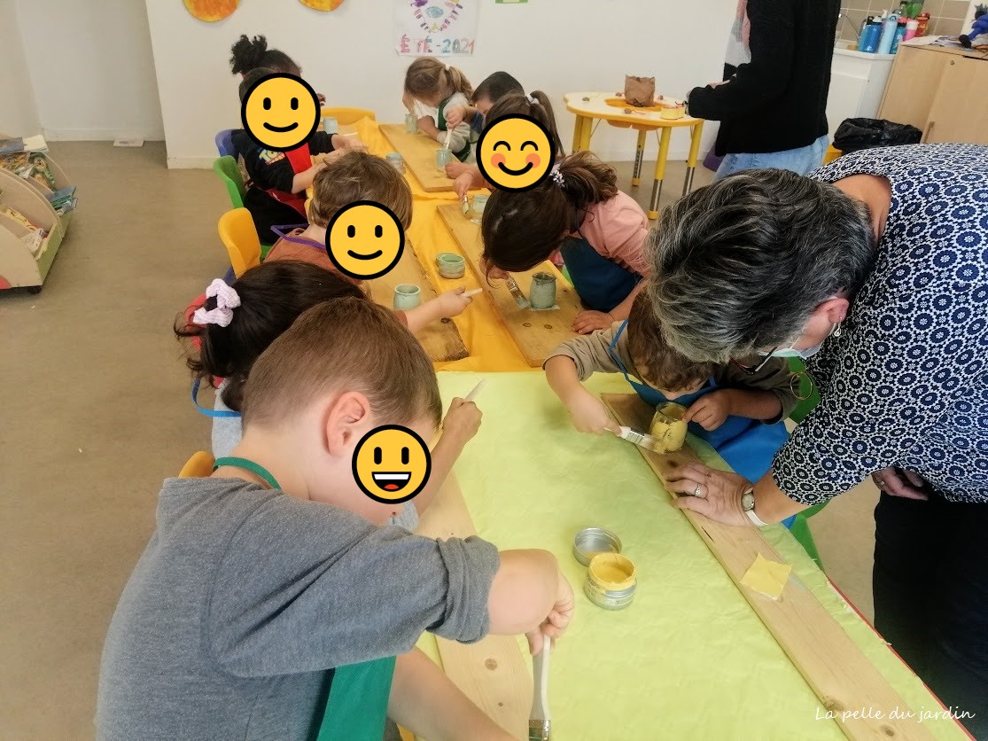 Le pot deviendra une mangeoire à oiseaux : nous avons donc commencé par le peindre avec de jolies couleurs pastelles ( jaune, verte, bleue).