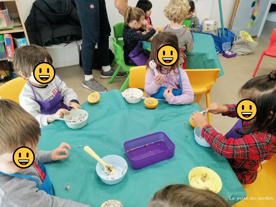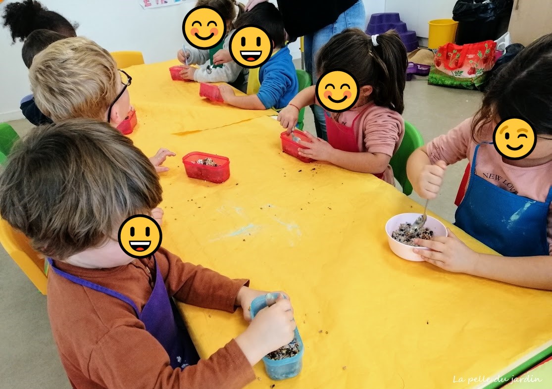 Sensibilisation des enfants à l’environnement : Connaître la nature qui nous entoure enrichit les enfants et les sensibilise au respect de la planète. La découverte du monde passe par des manipulations. Alors, j’ai proposé aux enfants de “cuisiner” à ces petits oiseaux très utiles au jardin des “gâteaux énergétiques” avec de la graisse et un mélange de graines et de les disposer dans de jolis petits mangeoires ‘faites maison’, et ils étaient très enthousiastes.