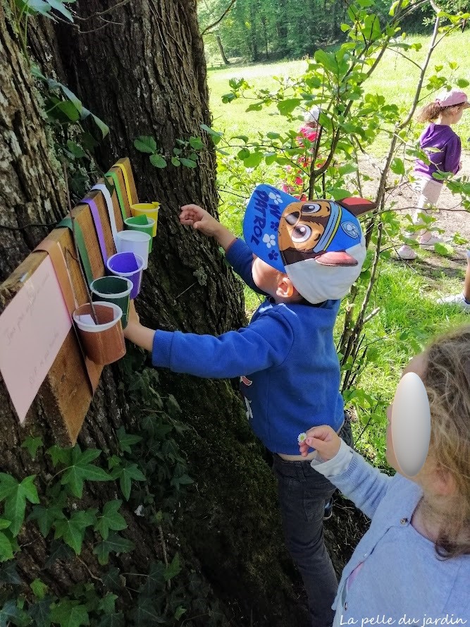 En fait l’arbre à 3 cous demande aux enfants de ramasser des végétaux de la même couleur que les petits pots ( vert clair, vert foncé, violet, jaune et blanc) C’est un peu la cacophonie, les enfants court dans tous les sens mais au résultat la mission est réussie, c’est le principal.
