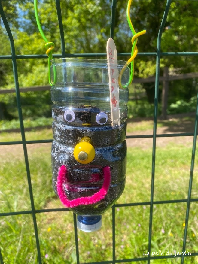 L’objectif était de faire du jardinage mais aussi d’égayer le grillage du centre. Nous avons donc choisi de planter dans des contenants de récupération  ( bouteilles, boites de conserve).