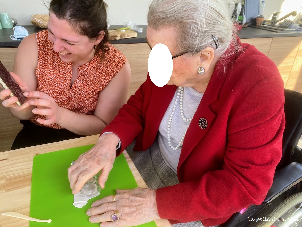 En cette saison, le potager est loin d’être très fourni mais entre petites haltes devant les légumes de printemps comme les pois, les fèves, les choux… la découverte de la marre à poissons et son joli bruit d’eau ainsi que les divers aromates pour réveiller tous les sens, ces dames ne se sont pas ennuyées. Au programme, rires, causettes, anecdotes…