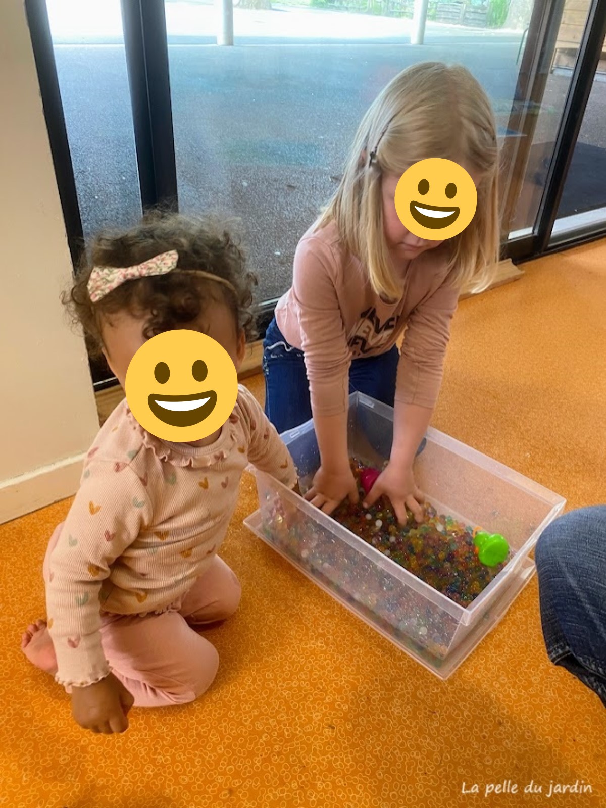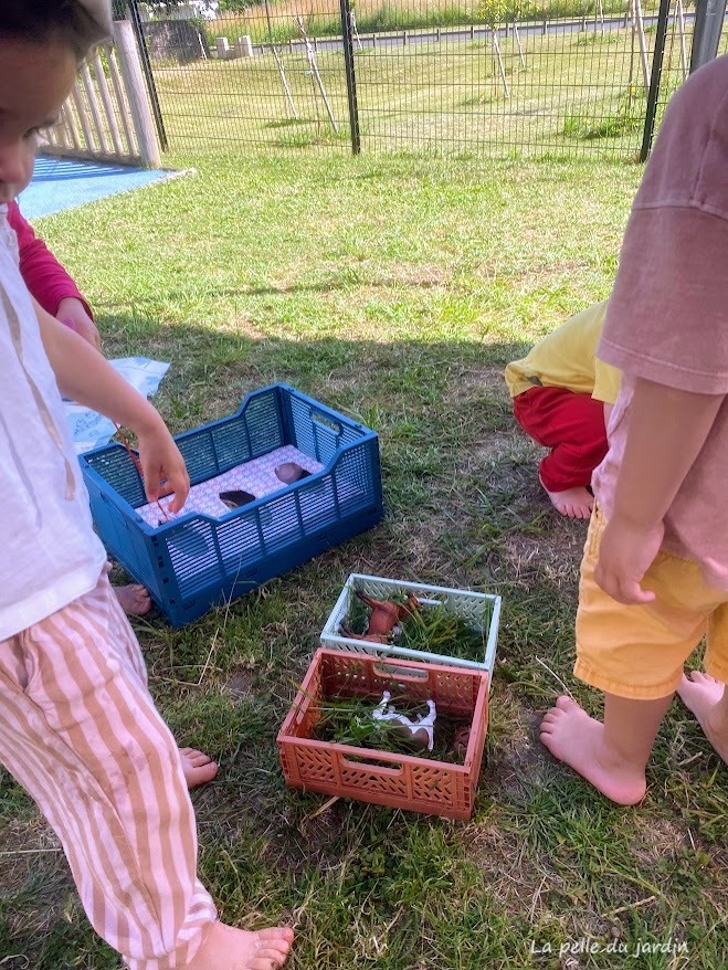 j’ai placé plusieurs boites, certaine avec de l’eau gélifiée. Le principe du jeu est de plonger les mains dans de l’eau où réside différents objets. L’objectif de ce jeu est de permettre aux enfants d’améliorer la préhension (action de saisir), de développer leur sens tactile et de susciter de la curiosité.