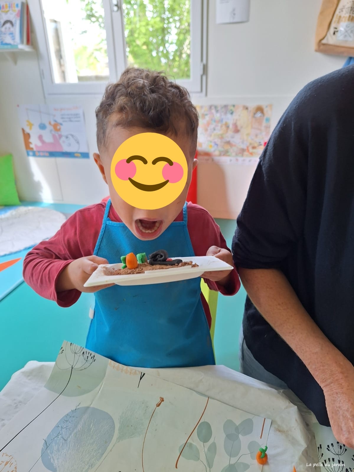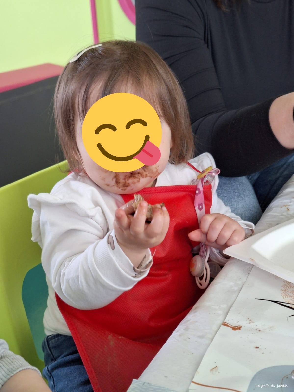 Quoi de mieux pour inaugurer l’idée que de s’offrir une gourmandise très chocolatée avec la création d’un gâteau en trompe-l’oeil représentant un jardin potager. Oh! Je vous entends déjà : “un gâteau en trompe-l’oeil avec des enfants de moins de 3 ans ?! Impossible”… Et si c’est possible, et je dirai même qu’ils se sont très bien débrouillés et qu’ils se sont évidemment régalés.