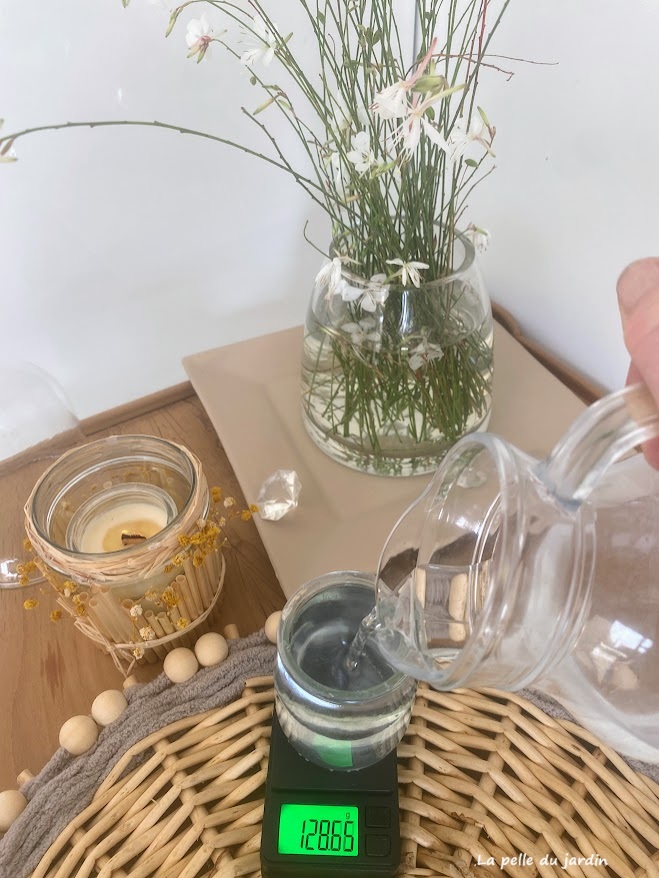 La première étape consiste a remplir notre contenant pour la bougie d’eau jusqu’au niveau ou l’on souhaite que la bougie arrive et on voit le poids que cela fait.