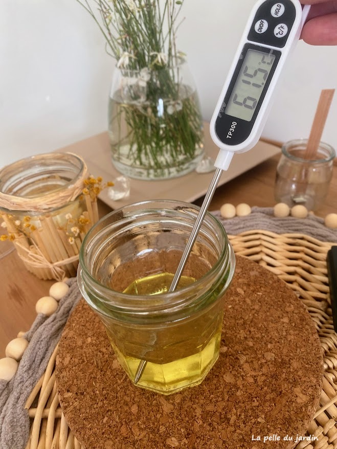 Après avoir fait fondre votre cire au bain-marie, vous allez devoir faire descendre la température de la cire car, lors du mélange ‘cire parfums’, il est impératif de respecter certains critère :
