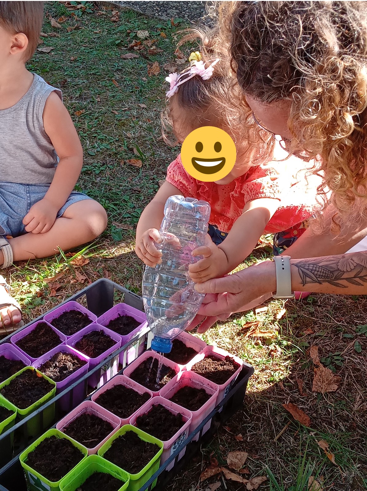 L’objectif N°2 : Faire pousser des aromates pour les installer dans le jardin. Commence alors l’atelier avec la séquence transvasement de terre dans des godets. Suit la séquence motricité fine pour semer les petites graines avant l’arrosage et évidemment la petite histoire en lien avec l’atelier pour conclure l’activité.