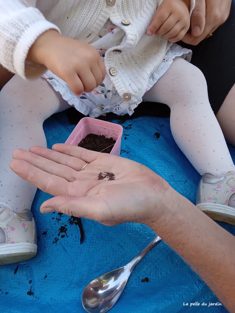 Une fois la mission du transvasement réussi, l’heure est à la motricité fine, a la concentration…. réussir a attraper entre ses doigts les toutes petites graines de menthe, sauge, ciboulette et thym pour les déposer dans les godets.