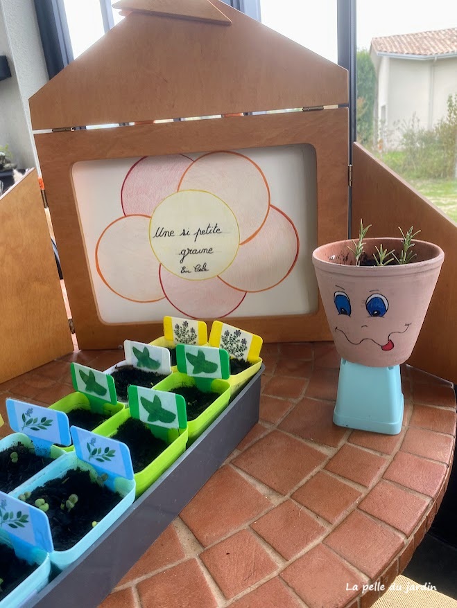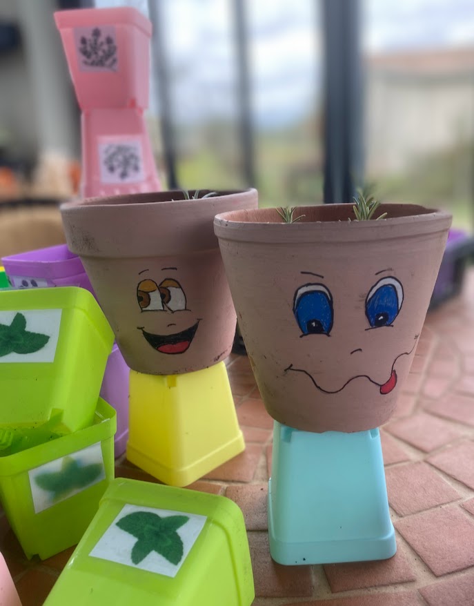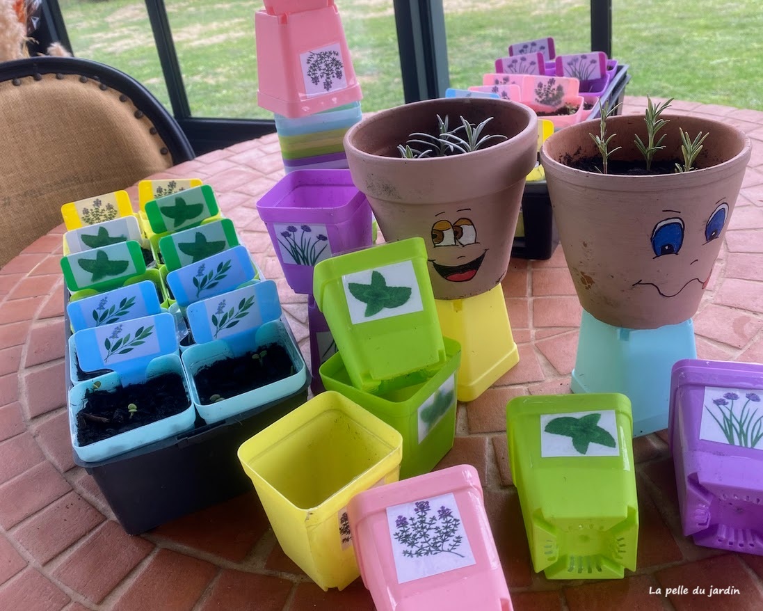 De nombreux aromates prendront place dans le jardin dans des pots ultra colorés en forme de bonhommes, mais pour le moment l’heure est au semi.