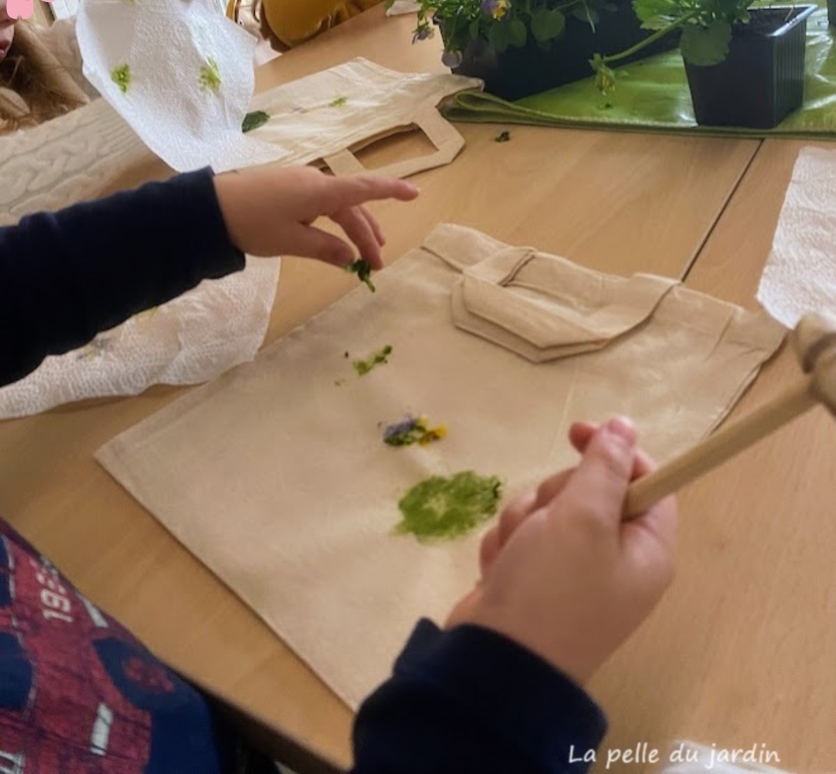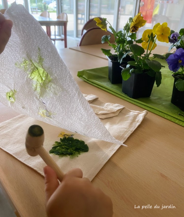 Le Tataki-Zomé c’est faire apparaitre des couleurs en tapant de tout son cœur sur les végétaux. Du jaune, du vert du rose…. Et on répète ses gammes de couleurs, et on apprend en s’amusant.