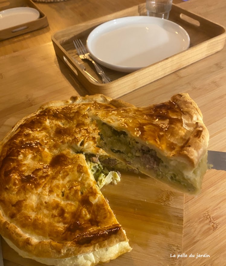 - Rabattre le bord de la pâte vers l’intérieur, mouiller avec un peu d’eau et poser la deuxième pâtes, pressez les bords pour les coller et bien les souder, dorez le couvercle avec un jaune d’œuf battu, piquer plusieurs fois à la fourchette, faire de jolis dessin et une cheminée au centre, puis enfourner aussitôt.