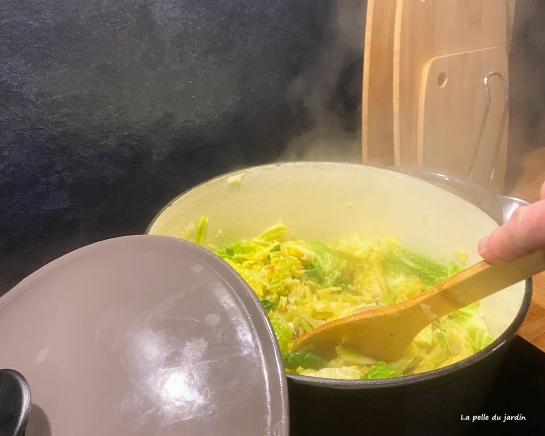 - Versez le bouillon et laissez cuire doucement à couvert env. 15 min ( le chou doit rester croquant).